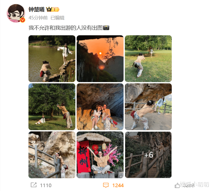 4月27日,钟楚曦在个人社交平台晒出自己和好友的旅行照,与以往不同的是钟楚曦这次晒出的不是自己的美照,而是为了让同行人出片,自己贡献各种高难度动作的照片。钟楚曦配文称:我不允许和我出游的人没有出图📸有这样的旅游搭子也太完美了吧,咱就说说多少人羡慕了?